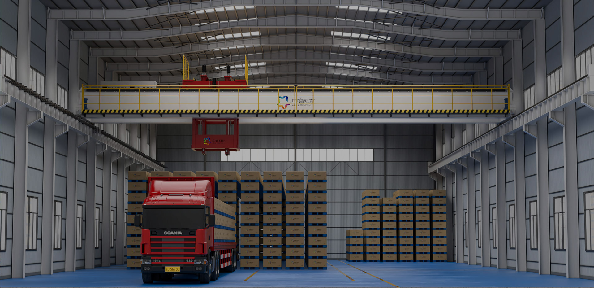 重載倉(cāng)儲(chǔ)物流及自動(dòng)裝卸車(chē)一體化總體方案由地堆平庫(kù)、空中物流機(jī)器人、物流調(diào)度及管理系統(tǒng)組成。